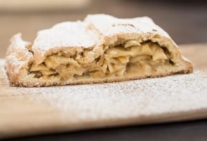 Die nicht zu kalte Butter mit dem Zucker, der Zitronenschale und dem Vanillezucker in einer Schüssel rasch zu einer homogenen Masse verarbeiten (bis keine Butterstücke mehr zu sehen sind). Das Ei und die Milch dazugeben, das Mehl und das Backpulver beimischen und zu einem Teig kneten. Den Teig vor Gebrauch 1/2 Stunde ruhen lassen. Die Äpfel schälen und entkernen, in kleine Scheiben schneiden und mit dem Zucker, den Bröseln, den Sultaninen, den Pignoli, dem Rum, dem Vanillezucker, dem Zimt und der Zitronenschale mischen. Das Backrohr vorheizen. Den Teig auf einem bemehlten Nudelbrett 40 x 20 cm groß ausrollen und auf ein mit Butter bestrichenes Backblech legen. Die Apfelfülle auf den Teig geben und den Strudel mit dem Teig einschlagen. Den Strudel mit dem verquirlten Ei bestreichen, mit den restlichen Teigstreifen verzieren und im Backrohr backen. Mit Staubzucker bestreuen.